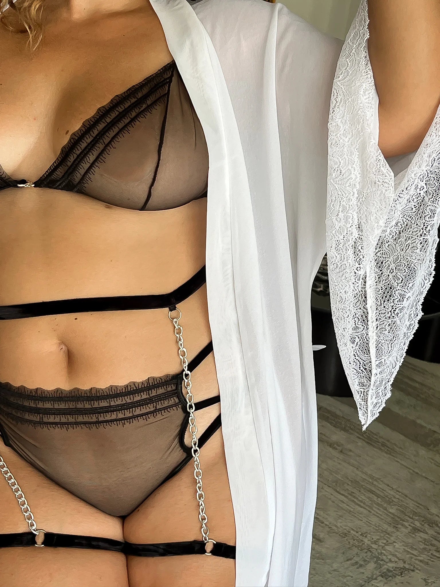 Dare to seduce with the CHAIN DESIRE Set, a bold 3-piece lingerie ensemble crafted in sheer black mesh and enhanced with metallic chain details. This set combines a soft triangle bra, strappy high-waist thong, and garter-style leg chains for a look that’s both daring and unforgettable.