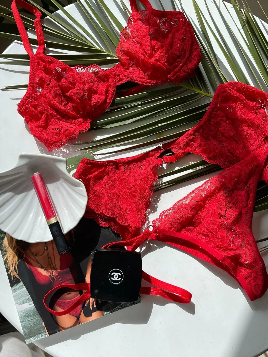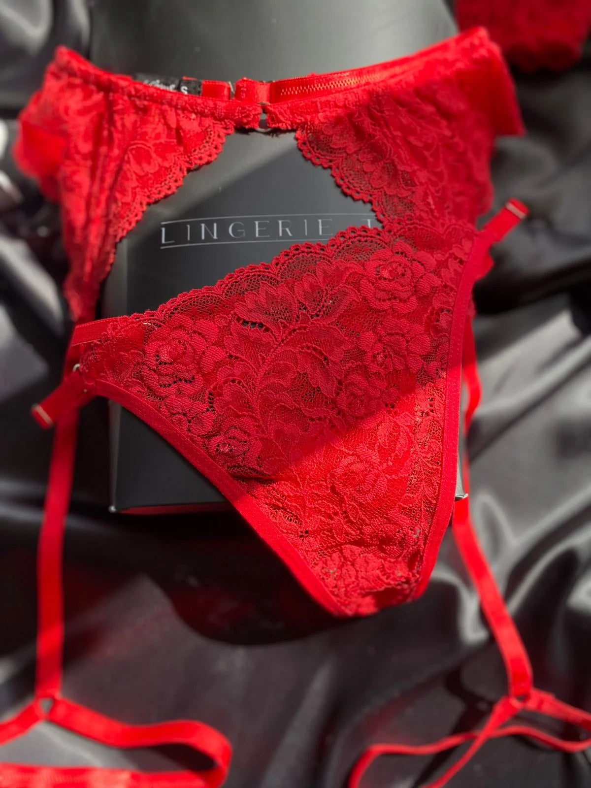 Ignite passion with the PASSION Set, a bold three-piece lingerie ensemble crafted from luxurious red floral lace. Designed to embody confidence and femininity, this set blends elegance with daring sensuality. The balconette bra enhances natural curves, the matching thong flatters with delicate lace details, and the garter belt completes the look with irresistible allure.